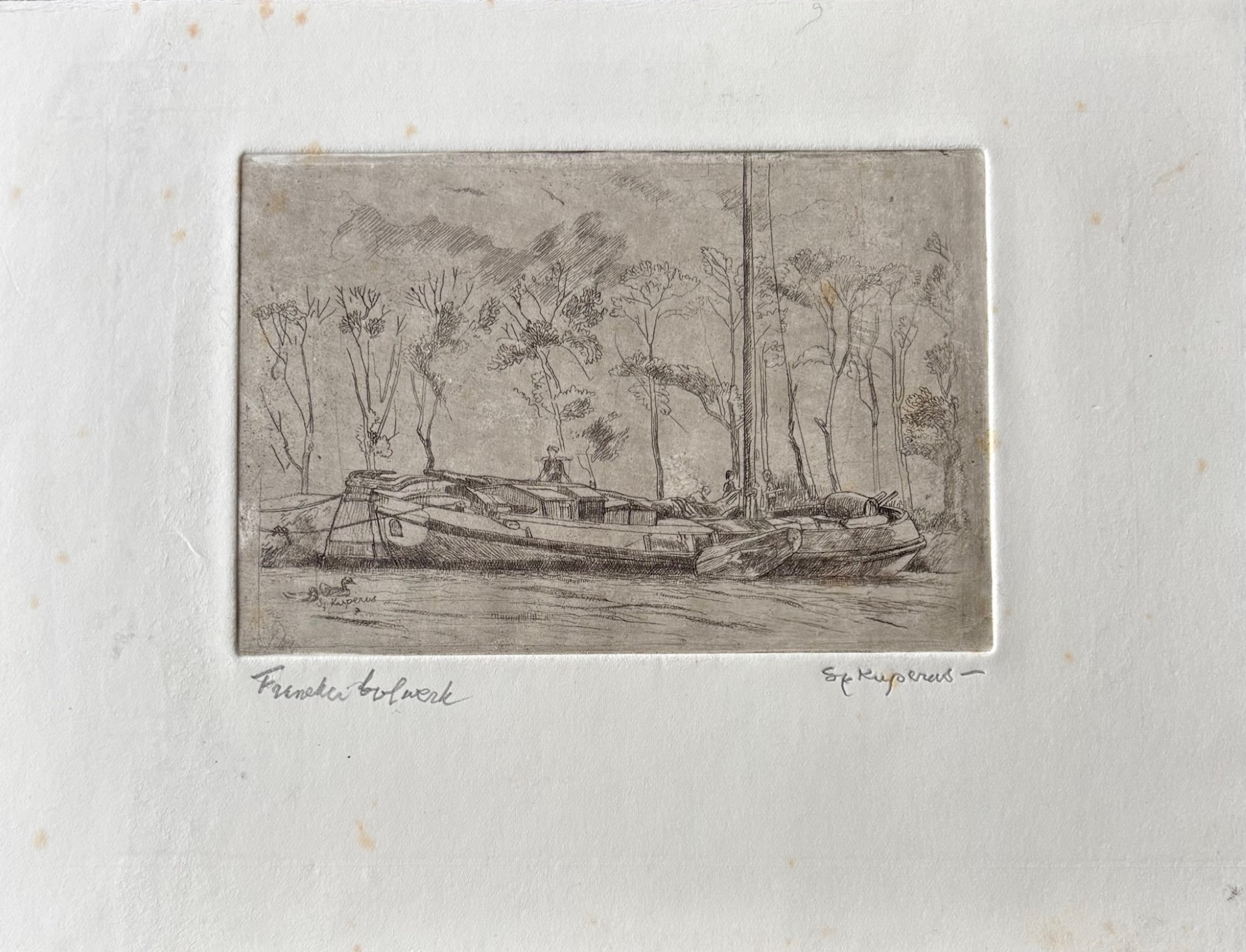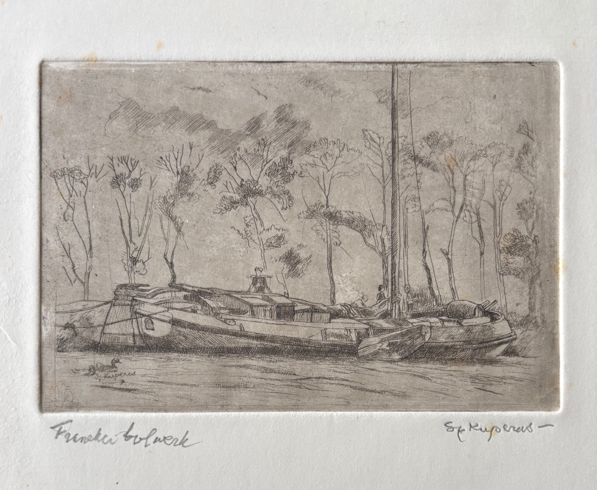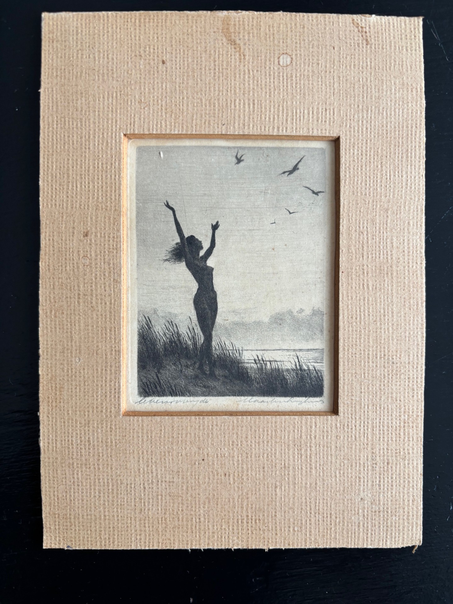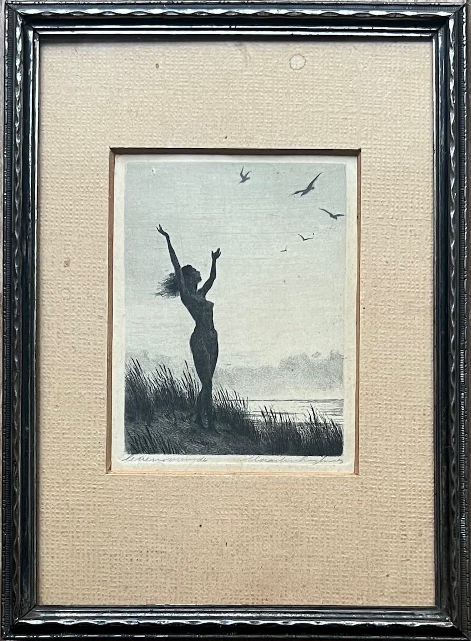 Ets met de titel levensvreugde. Beeldmaat 7 cm x 9 cm. Authentiek ingelijst in een oud wissellijstje. Met potlood gesigneerd.