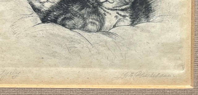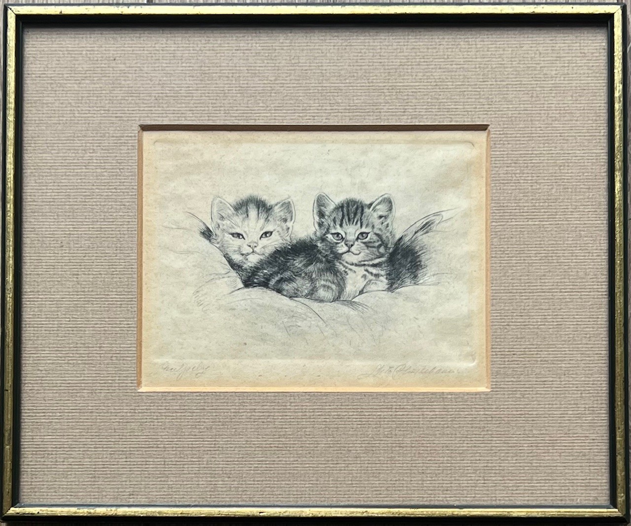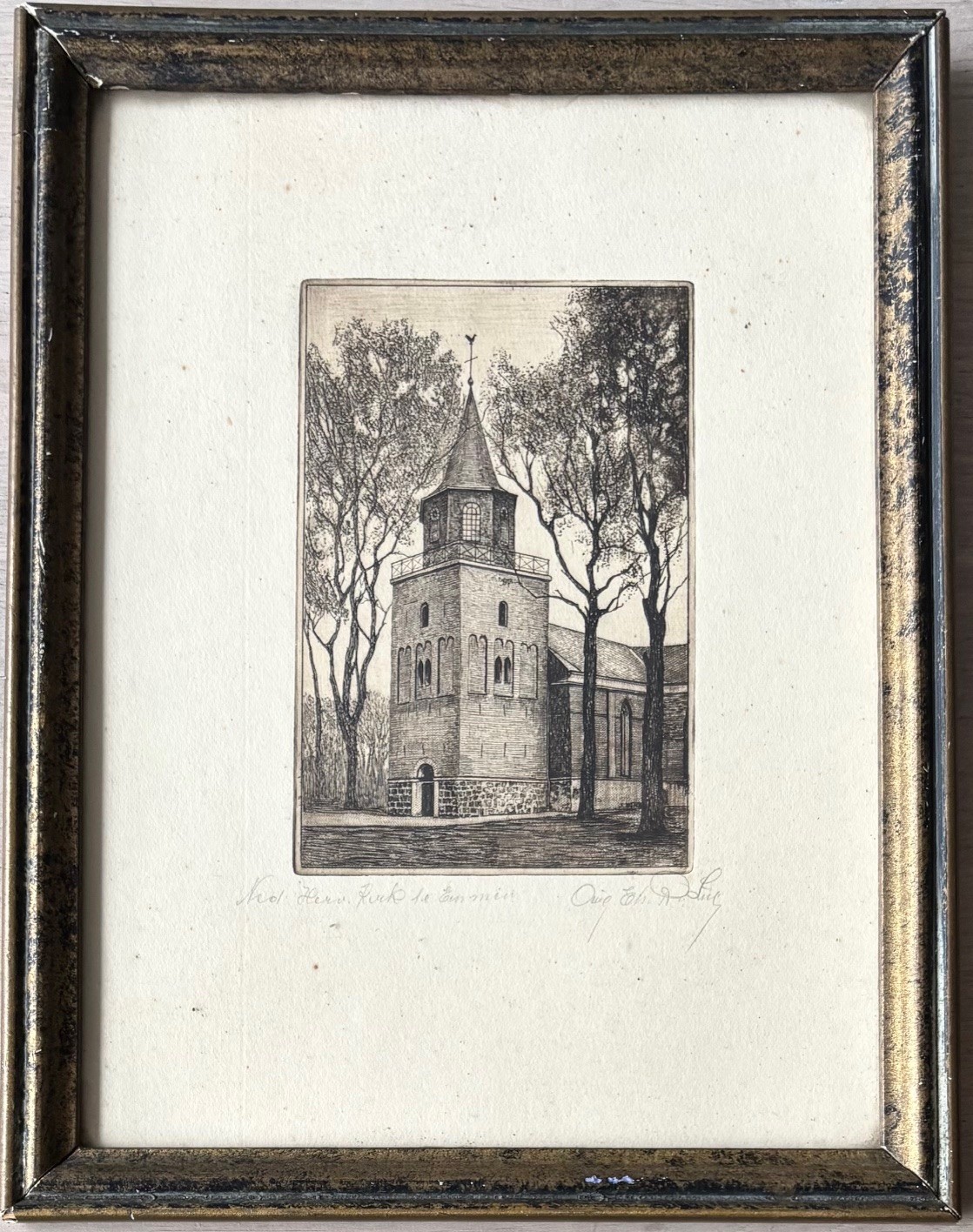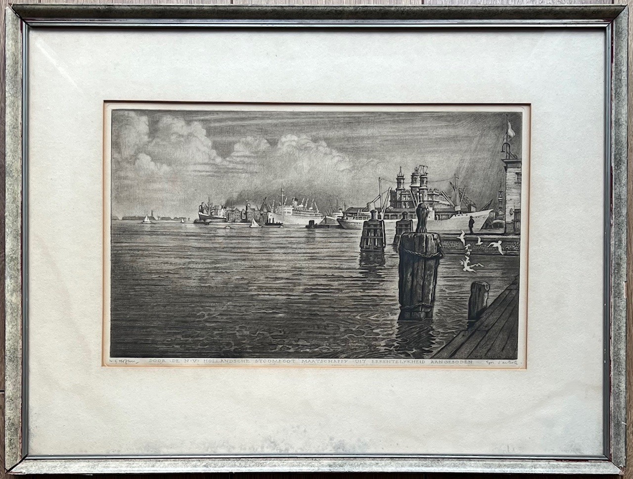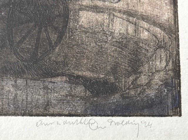 Ets met de titel levensvreugde. Beeldmaat 7 cm x 9 cm. Authentiek ingelijst in een oud wissellijstje. Met potlood gesigneerd.