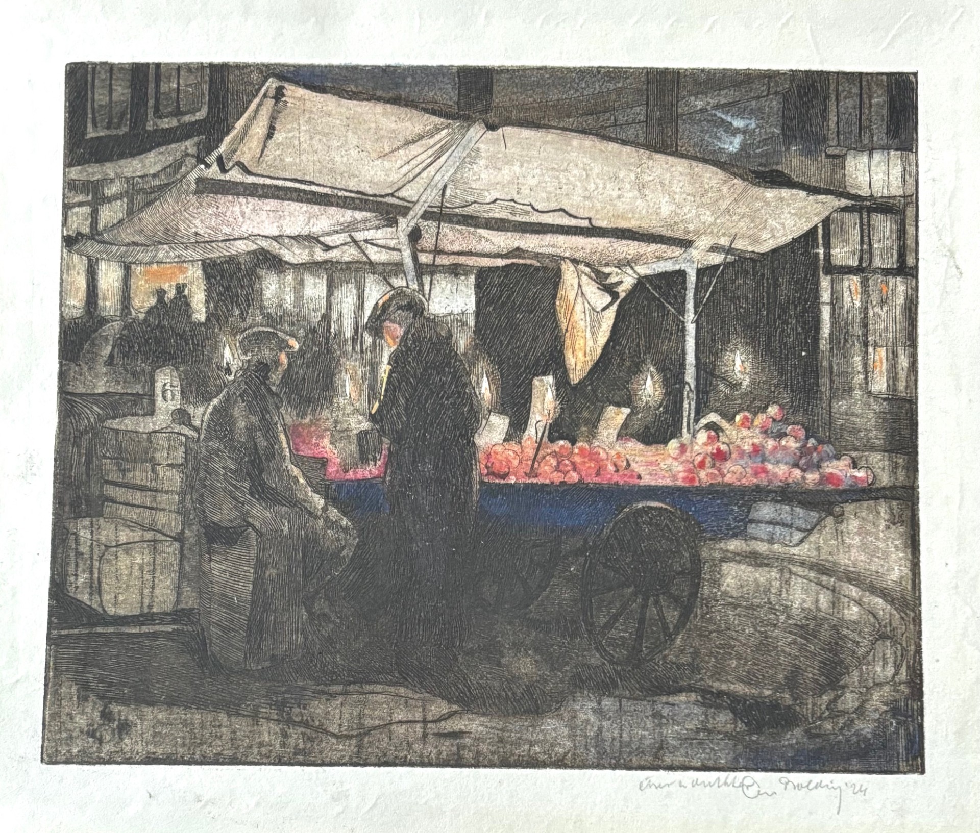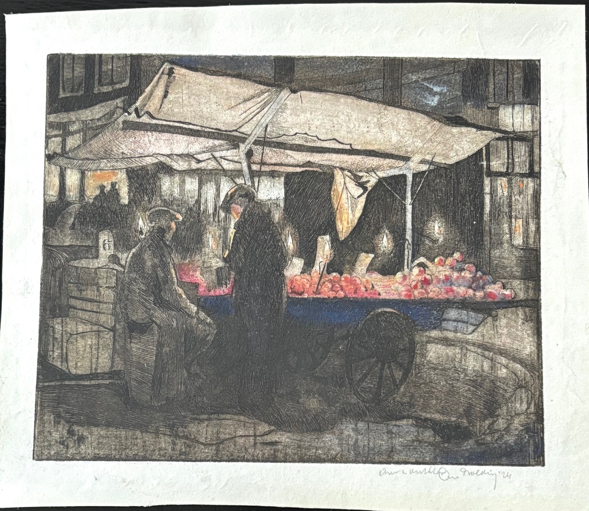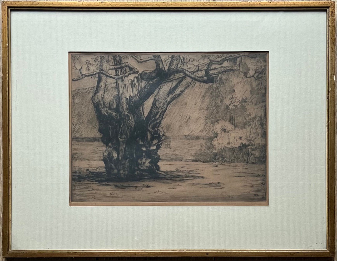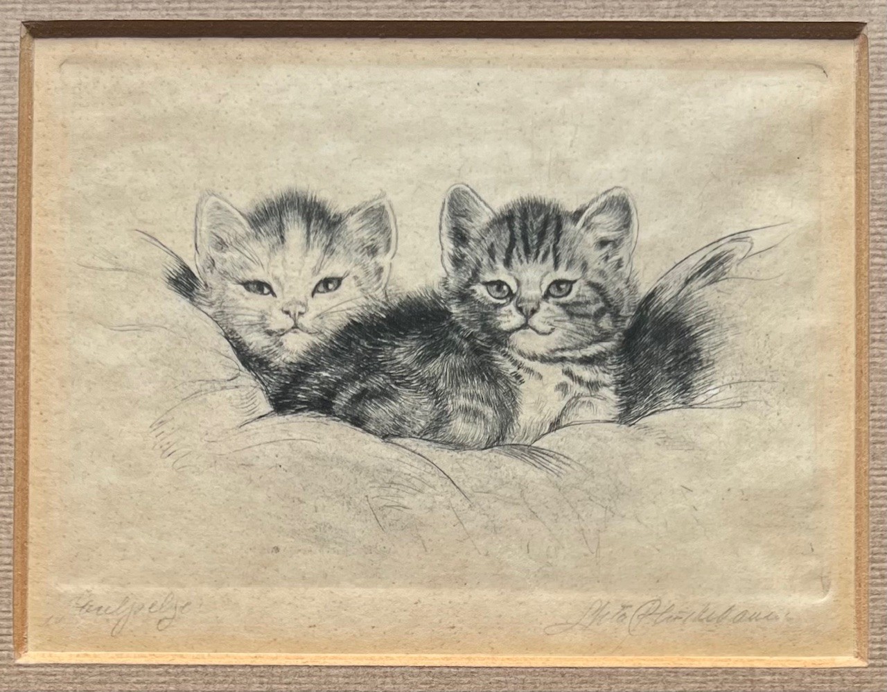 Ets met de titel levensvreugde. Beeldmaat 7 cm x 9 cm. Authentiek ingelijst in een oud wissellijstje. Met potlood gesigneerd.