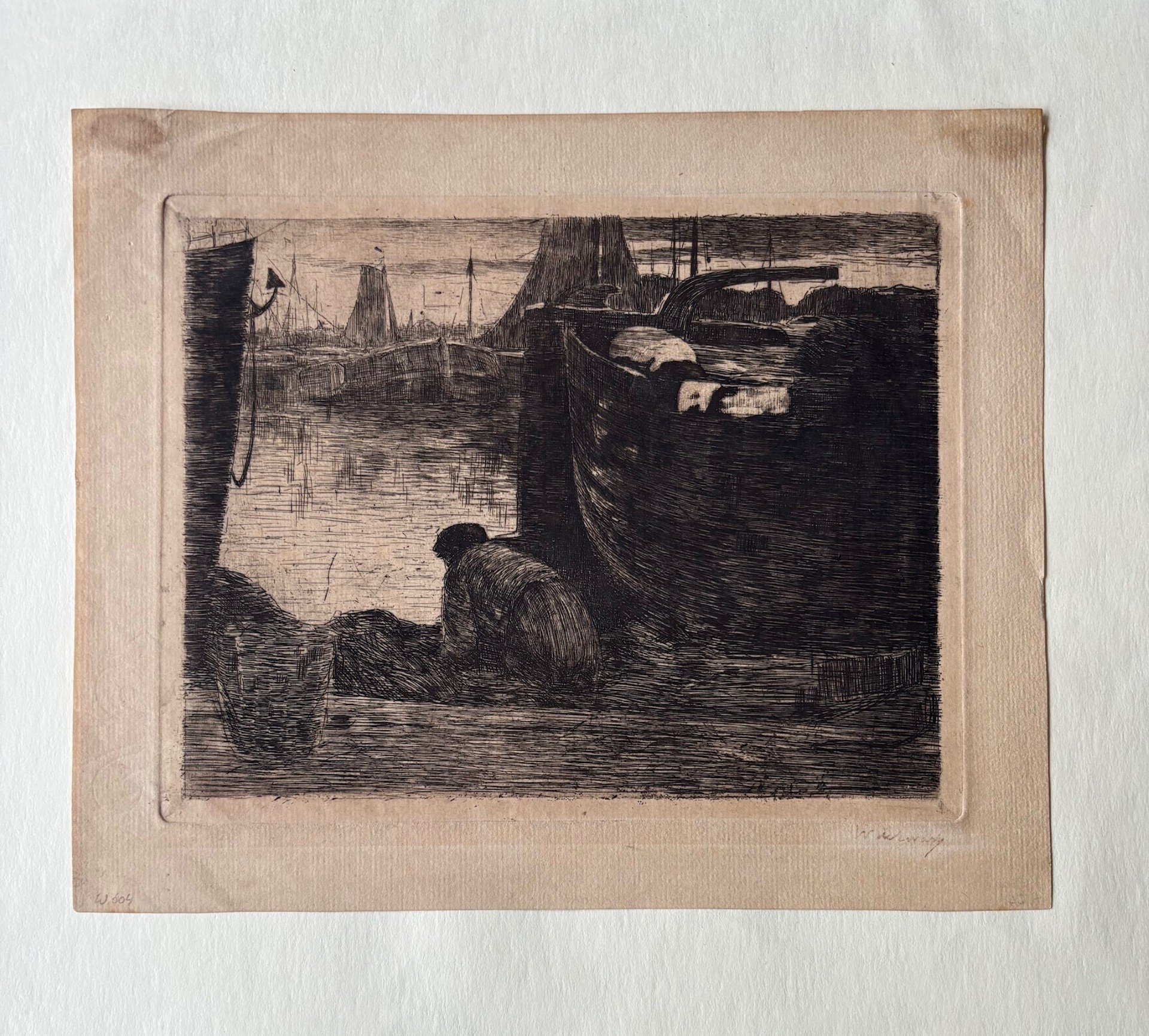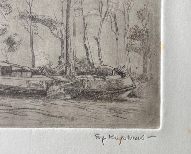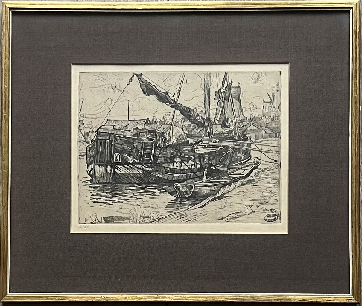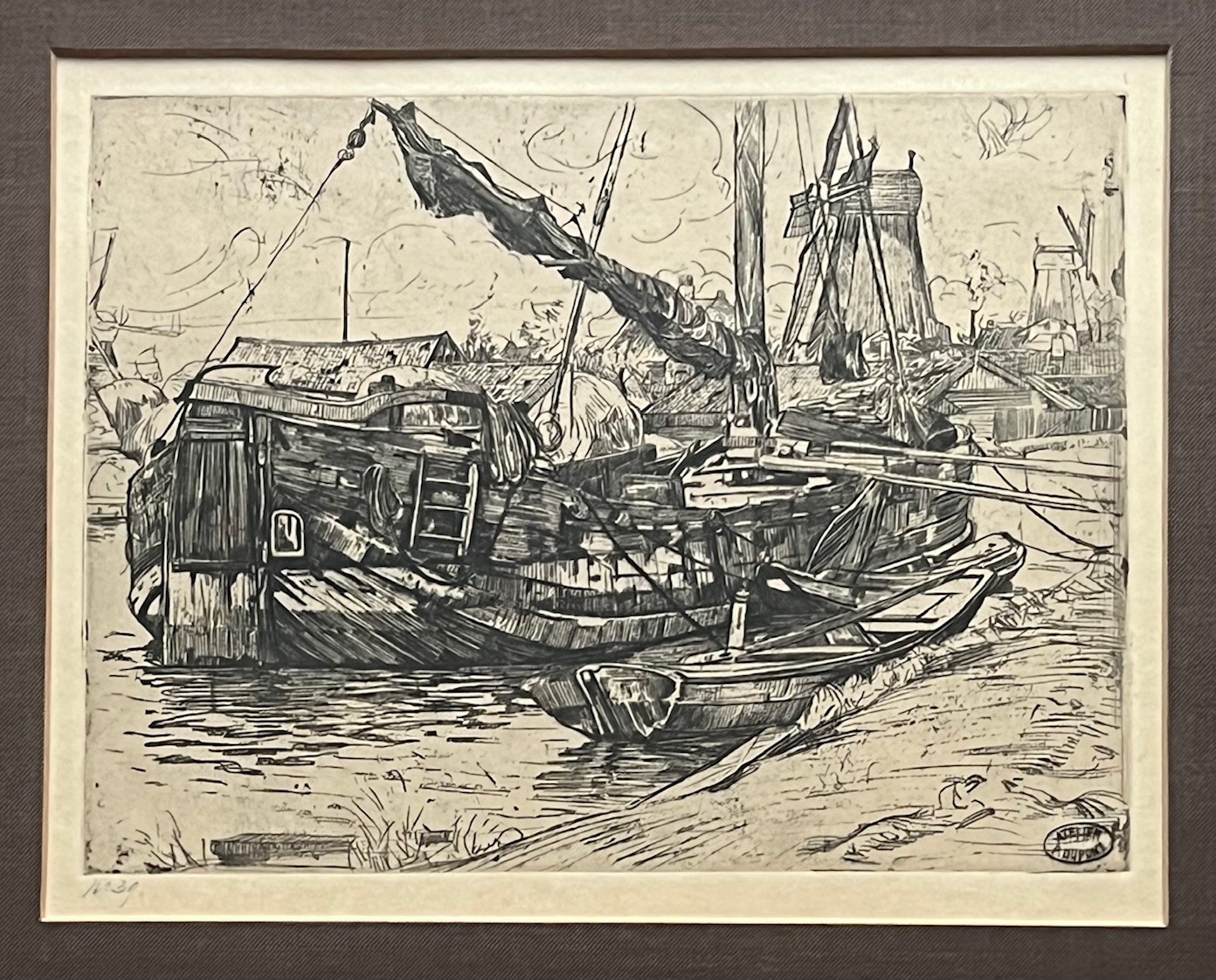 Ets met de titel Tjalk aan de Baarsjes. Ets gemaakt omstreeks het einde van 1895 aan de Baarsjes in Amsterdam. De Baarsjes was een buurtschap in de voormalige gemeente Sloten en maakt nu deel uit van de Amsterdamse wijk De Baarsjes. De buurtschap lag aan de Kostverlorenvaart. Een tjalk ligt gemeerd met op de achtergrond drie molens. Beeldmaat 20 cm x 15 cm. Catalogus van Wisselingh No. 344 in een oplage van 50 exemplaren. Gedrukt onder toezicht van Willem Witsen. Nog authentiek ingelijst. Atelierstempel in de plaat en linksonder met potlood genummerd.
