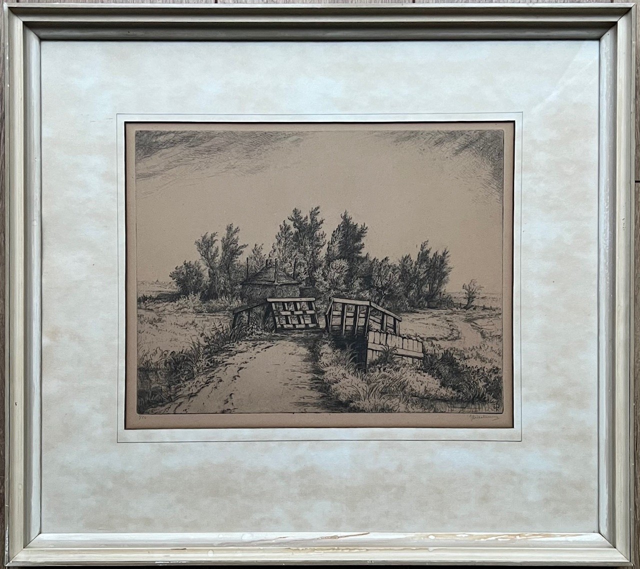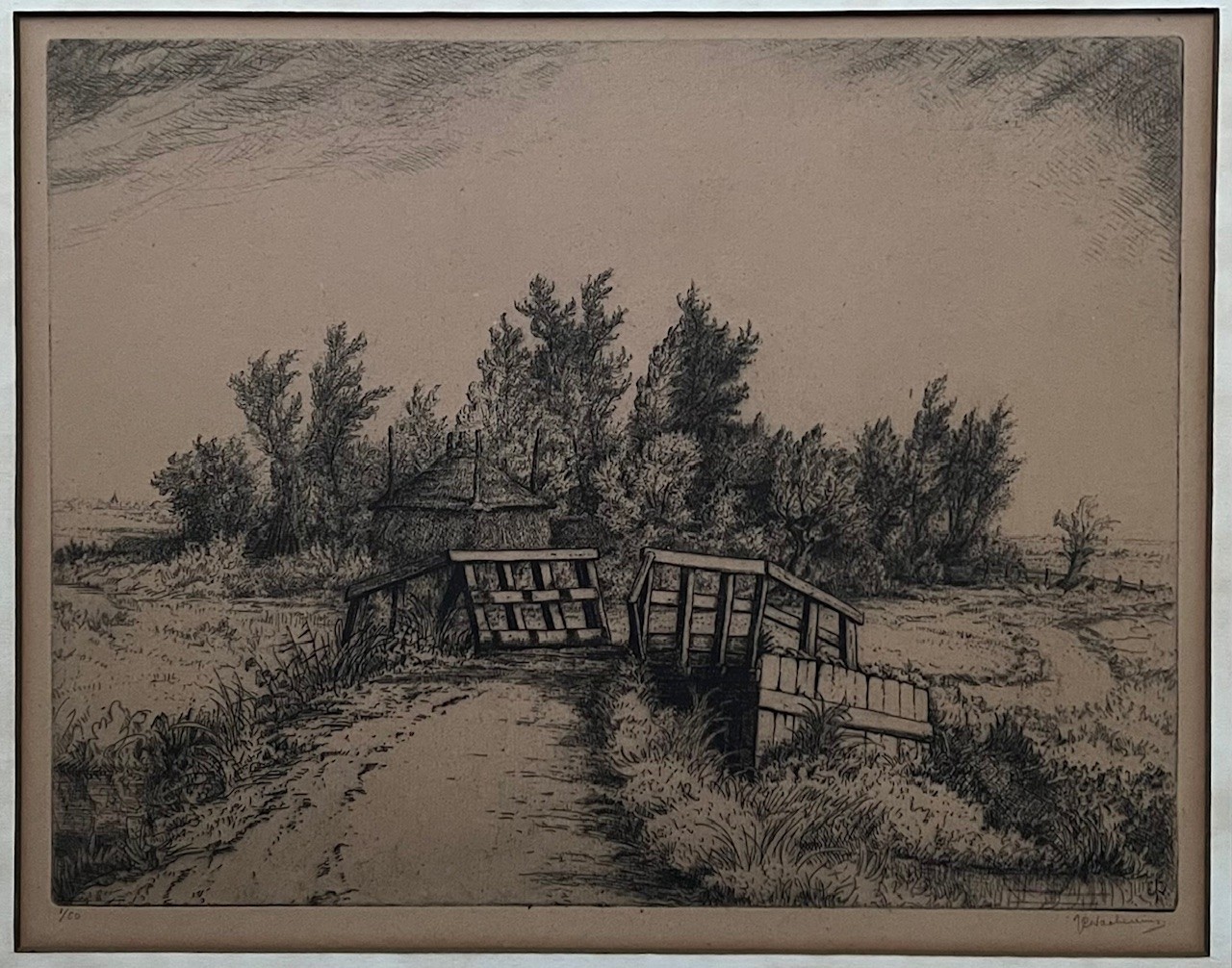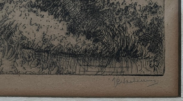 Ets met de titel langs de Grift. De Grift is een waterloop op de Veluwe in de Nederlandse provincie Gelderland. Beeldmaat 26 cm x 34 cm. Authentiek ingelijst in een houten lijst. Oplage 1/50. Monogram in de plaat. Met potlood gesigneerd en genummerd.