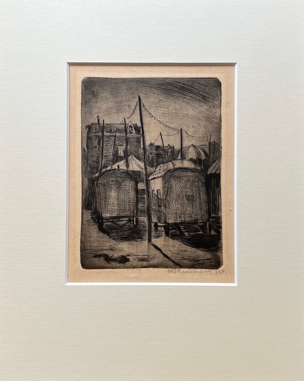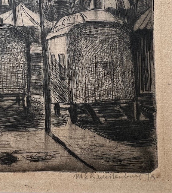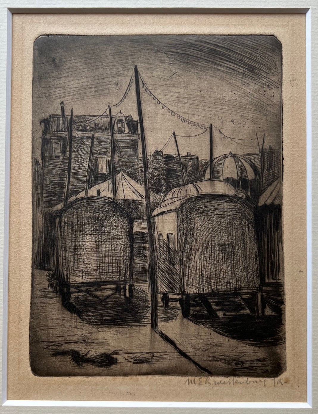 Houtsnede gemaakt omstreeks 1930. We zien een strandvoorstelling met een aantal badkoetsen. Badgasten – vooral vrouwen – konden zich in de koets verkleden terwijl de koets naar diep water werd gereden. De koets werd gedraaid met de ingang van het strand af gericht. Zo konden de gebruikers onbespied te water gaan. Badkoetsen waren te vinden langs de kusten van Engeland, Duitsland, Nederland en België. Beeldmaat 16,5 cm x 36,5 cm. Houtsnede zuurvrij ingelijst in een nieuwe houten lijst met museumglas. Met potlood gesigneerd en genummerd.